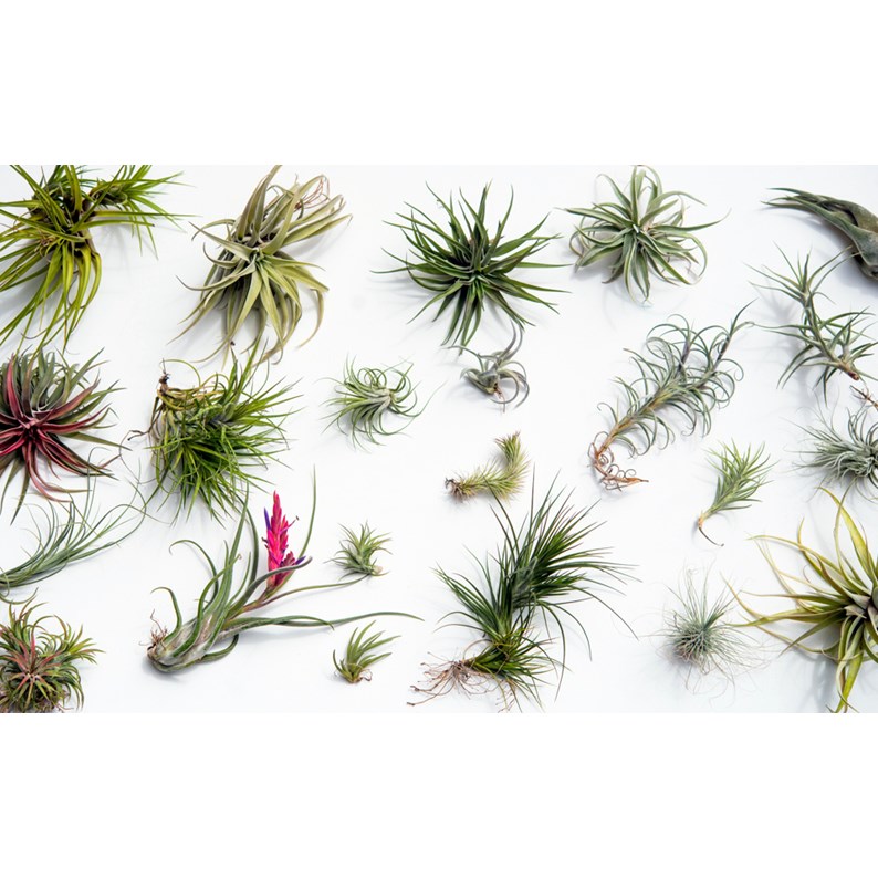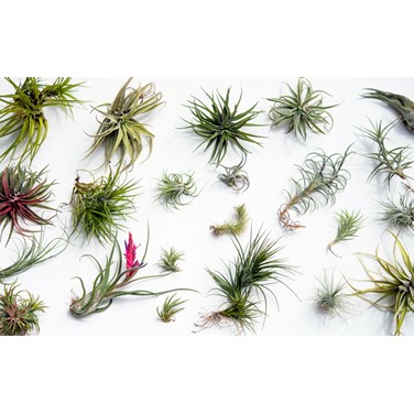 La Tillandsia est une famille de broméliacées qui comprend plus de 400 espèces. Ces plantes sont originaires des forêts, des déserts et des montagnes d'Amérique du Sud et d'Amérique centrale. Presque toutes les Tillandsia sont épiphytes, c'est-à-dire qu'elles n'ont pas ou presque pas de racines mais poussent sur des arbres ou des rochers. L'eau et les nutriments sont absorbés dans l'air par les écailles des feuilles, c'est pourquoi les Tillandsias sont aussi souvent appelées plantes aériennes. Dans ce mélange, vous recevrez au moins 4 espèces différentes de Tillandsias. Le choix de l'espèce dépend de la disponibilité chez le producteur.