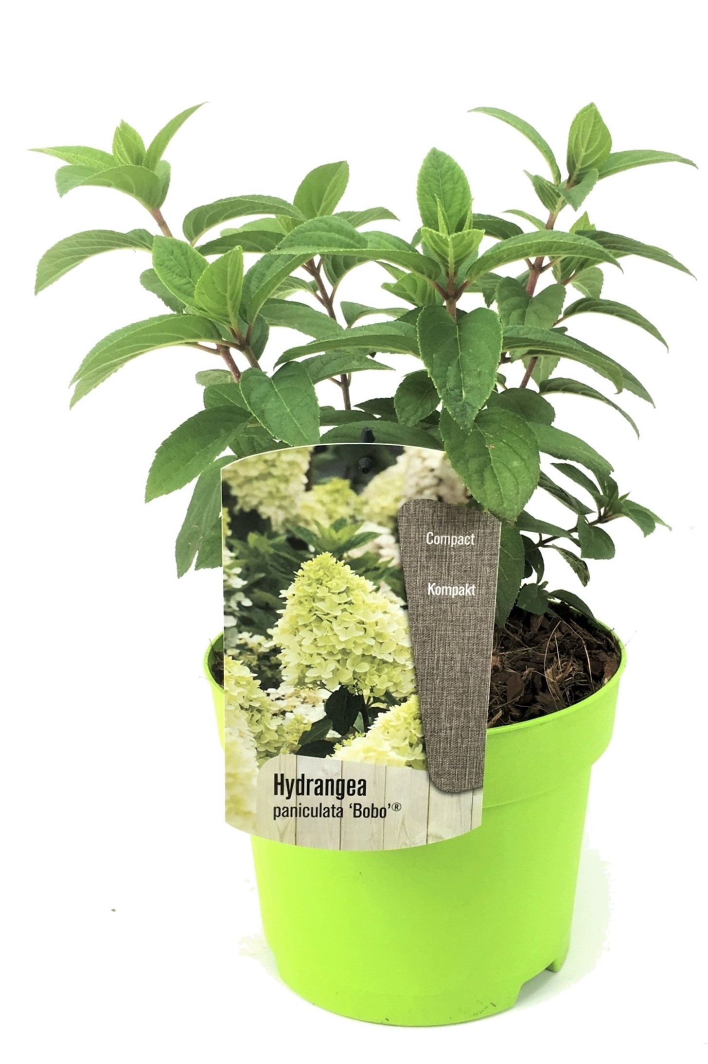 L'Hydrangea paniculata 'Bobo' est un magnifique hortensia paniculaire nain primé. C'est une plante compacte spéciale avec de belles panicules de fleurs vert-blanc en forme de cône qui virent au rose clair plus tard dans la saison. Ces belles fleurs font de cet hortensia un spécimen unique ! L'hortensia à panicules est très joli lorsqu'il est planté en groupe, mais il attire également les regards en tant que solitaire ou dans un pot décoratif. Grâce à ses belles fleurs, le Bobo est également très décoratif en automne.