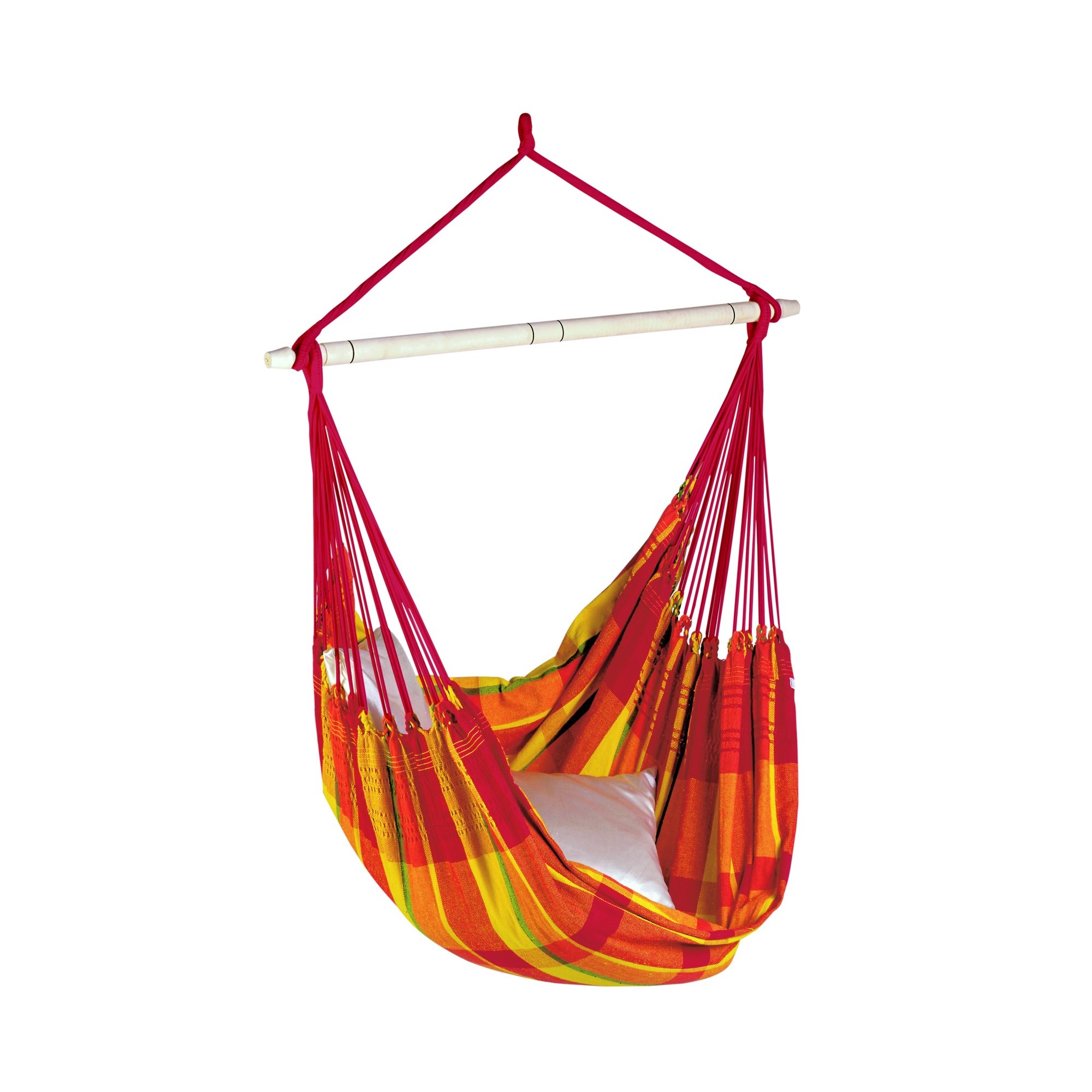 Avec une largeur de 1,30 m et une longueur de 1,60 m, le fauteuil suspendu Brasil King Size est presque aussi grand qu'un hamac brésilien classique. Les finitions à quatre coutures ainsi que le tissu extra-épais 400 g/m² garantissent une résistance accrue à la charge, comme pour tous nos hamacs brésiliens.