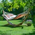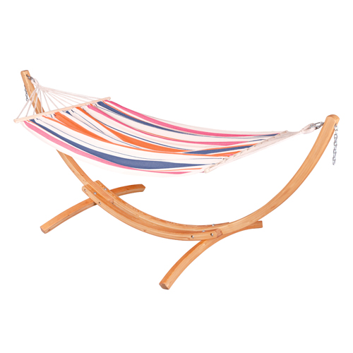 - Ce support accueille une toile de hamac aux rayures estivales. Grâce à son mélange de coton, polyester et viscose, la toile offre un grand confort tout en étant particulièrement résistante. Elle supporte un poids maximum de 120 kg.