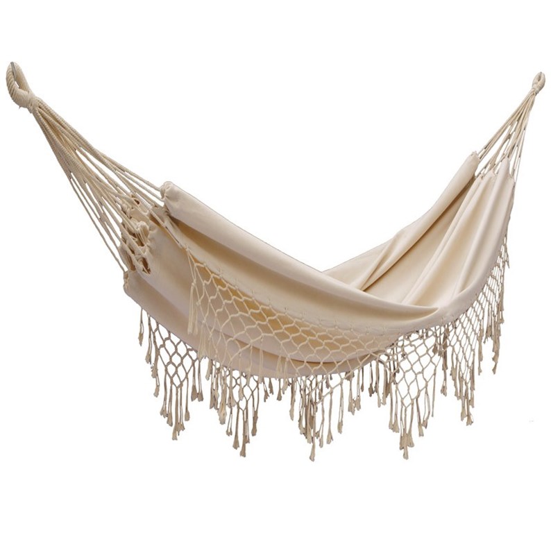 Que vous souhaitiez vous reposer en duo, lire à l’ombre ou simplement vous balancer doucement au soleil, ce hamac à franges est une solution confortable et esthétique pour embellir votre espace.