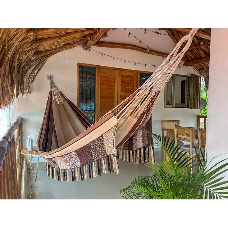 Les franges en tissage plat, discrètes mais élégantes, complètent le design de ce hamac sans le surcharger. Associées à des têtes en piola de coton naturel, elles soulignent le caractère authentique et rustique de la pièce.