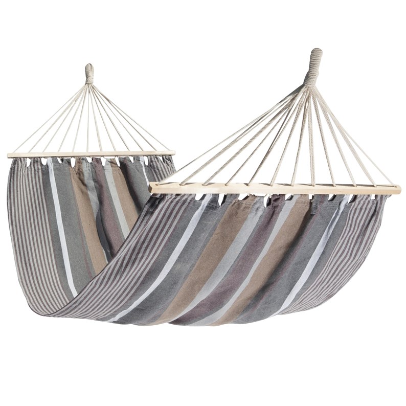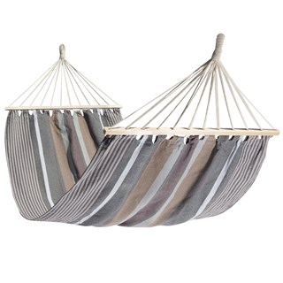Un très grand hamac simple à barre. Le tissus est plus large que la barre (1.20m vs 1m) afin de donner une courbe améliorant confort et stabilité