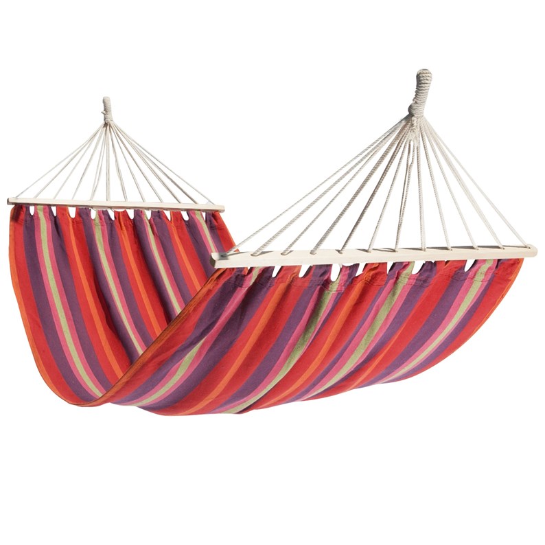 Un très grand hamac simple à barre. Le tissus est plus large que la barre (1.20m vs 1m) afin de donner une courbe améliorant confort et stabilité