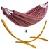 Le bois de mélèze garantit robustesse et durabilité, tandis que le petit hamac violet apporte confort et style. Un ensemble pratique et fiable pour profiter de moments de détente.