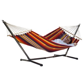 Un très grand hamac simple à barre avec support métal. Le tissus est plus large que la barre (1.20m vs 1m) afin de donner une courbe améliorant confort et stabilité, livré avec une housse de rangement dans le même tissus et un support à la finition robuste.