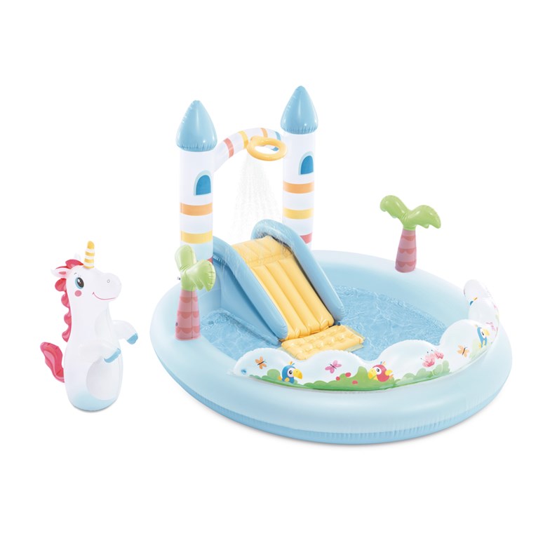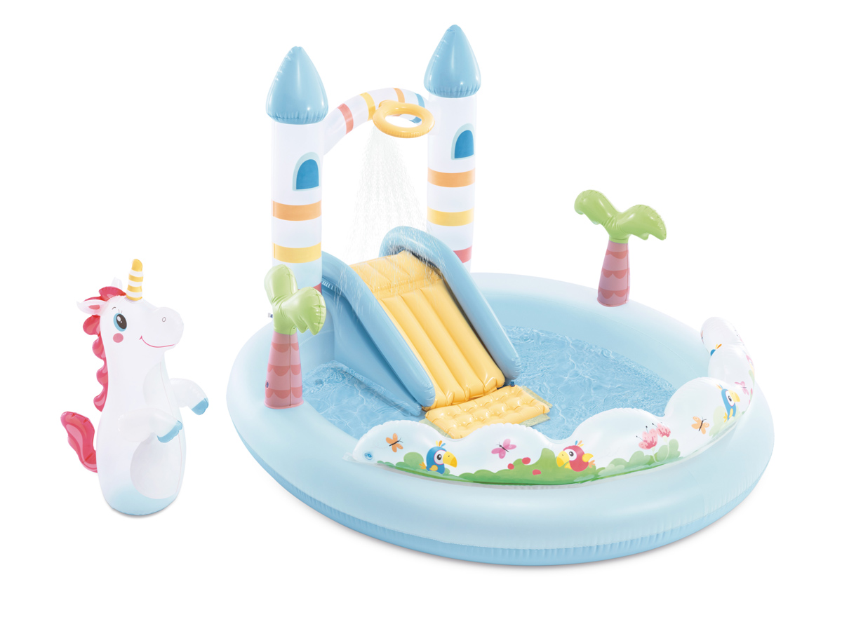 Pour encore plus de plaisir, cette aire de jeux aquatique gonflable Intex est équipée d'un pulvérisateur intégré, facilement raccordable à un tuyau d'arrosage, qui diffuse une pluie rafraîchissante lors des journées ensoleillées. Une licorne gonflable incluse vient compléter l'ensemble pour enrichir les jeux et prolonger la magie. À la fois ludique, rafraîchissante et conviviale, cette aire de jeux château magique est idéale pour offrir aux enfants des moments inoubliables de jeu, de fraîcheur et de rêve, directement dans le jardin.