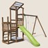 Les deux plateformes sont accessibles par une échelle avec corde ou un mur d'escalade. Une fois en haut, les enfants peuvent s'élancer sur le toboggan sécurisé de 2,20 m pour des descentes en toute autonomie. Le bac à sable ombragé sous la tour offre un coin calme et créatif.