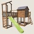 Le toboggan fixé solidement à la terrasse promet des descentes ludiques et pleines de sensations. Pour les plus audacieux, une corde à grimper permet d'accéder ou de descendre de la plateforme, renforçant la coordination et la confiance en soi. La petite maisonnette en bois perchée à 1,20 m offre un refuge chaleureux où les enfants peuvent inventer des histoires, se reposer ou accueillir leurs amis, renforçant ainsi le côté convivial et modulable de cette aire de jeux.