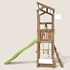 La tour centrale, accessible via une échelle ou une corde, stimule la motricité globale et offre un espace pour laisser libre cours à l'imagination. Son toit protège la plateforme, haute de 1,20 m, permettant aux enfants de se tenir en hauteur, observer les alentours, et se préparer avant de glisser sur le toboggan.