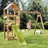 Le portique Nouméa propose deux balançoires en bois classiques et un toboggan. La plateforme couverte garantit une aire de repos et d'attente à l'abri, tandis que les poutres carrées robustes (9 x 9 cm) et les pieds solides (7 x 7 cm) assurent une excellente stabilité et sécurité, pour que les enfants puissent jouer en toute confiance.