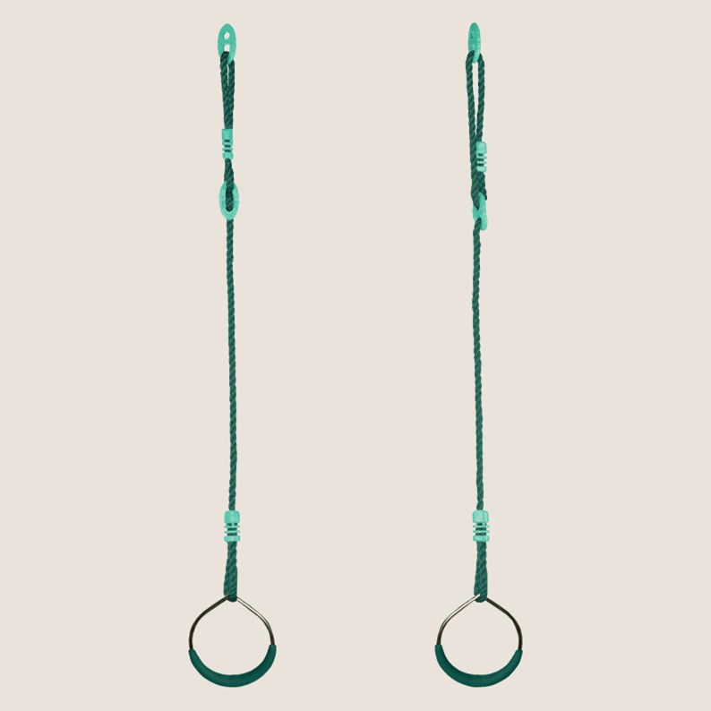 Les anneaux sont fabriqués en métal avec un surmoulage plastique qui améliore la prise en main et évite les glissements. Ils mesurent 13,5 cm de diamètre et peuvent supporter jusqu'à 50 kg. Grâce à leur conception robuste et à leur résistance aux intempéries, ils restent agréables à utiliser toute l'année.
