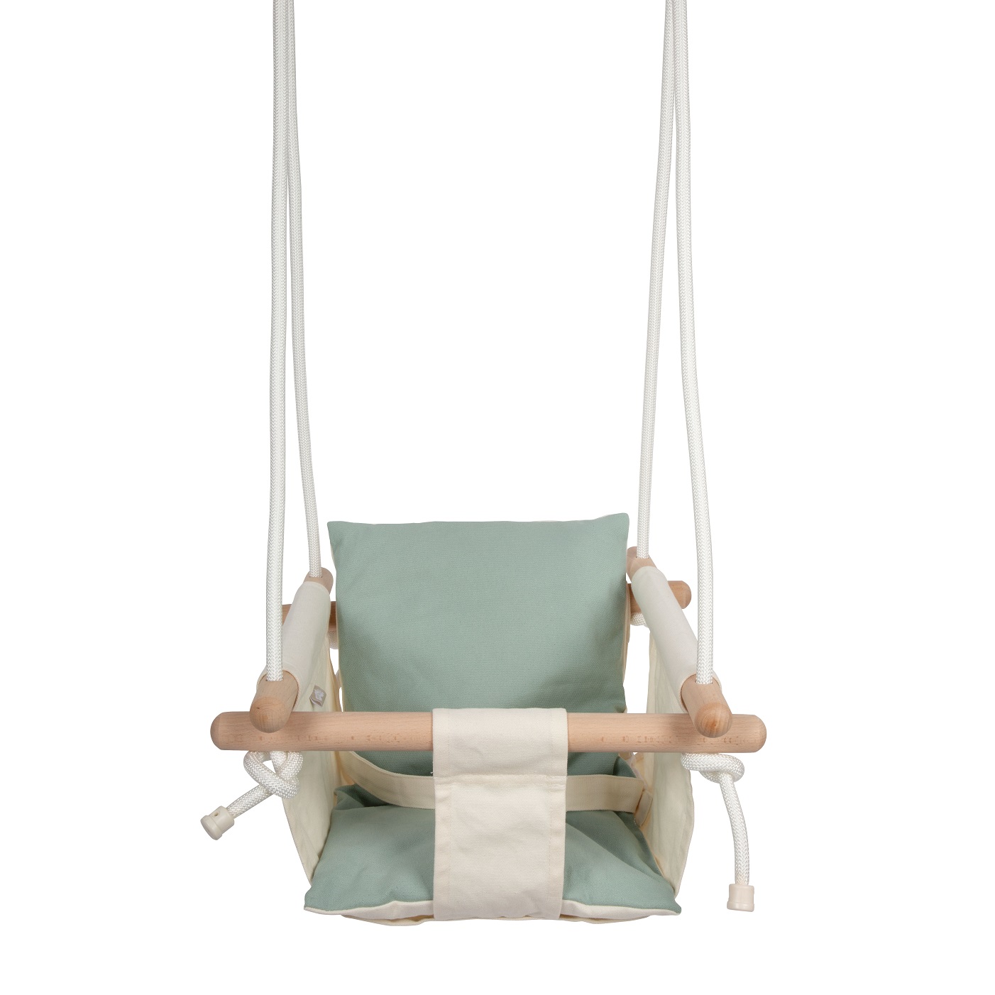 Cette balançoire pour bébé, au design simple et moderne, dispose d'anneaux métalliques et de mousquetons à vis pour l'accrochage.
