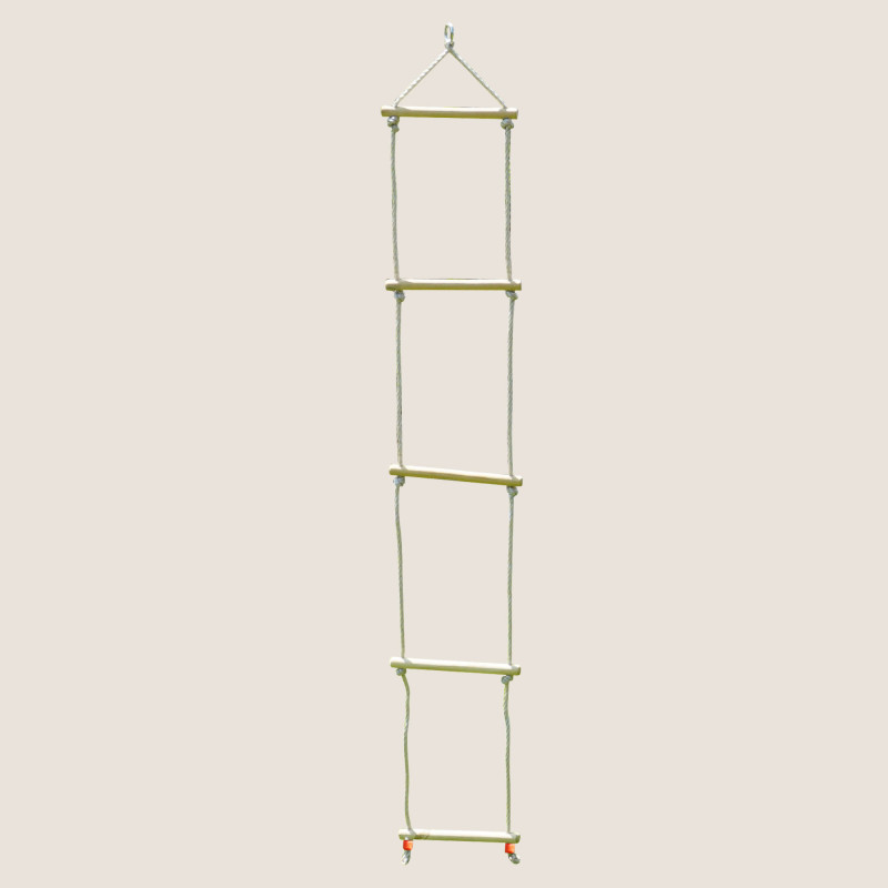 L'échelle est conçue avec des barreaux en bois robuste et des cordes solides, capables de supporter jusqu'à 50 kg. Les anneaux métalliques avec surmoulage plastique assurent une fixation stable et durable sur les crochets mousquetons (non fournis).