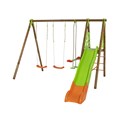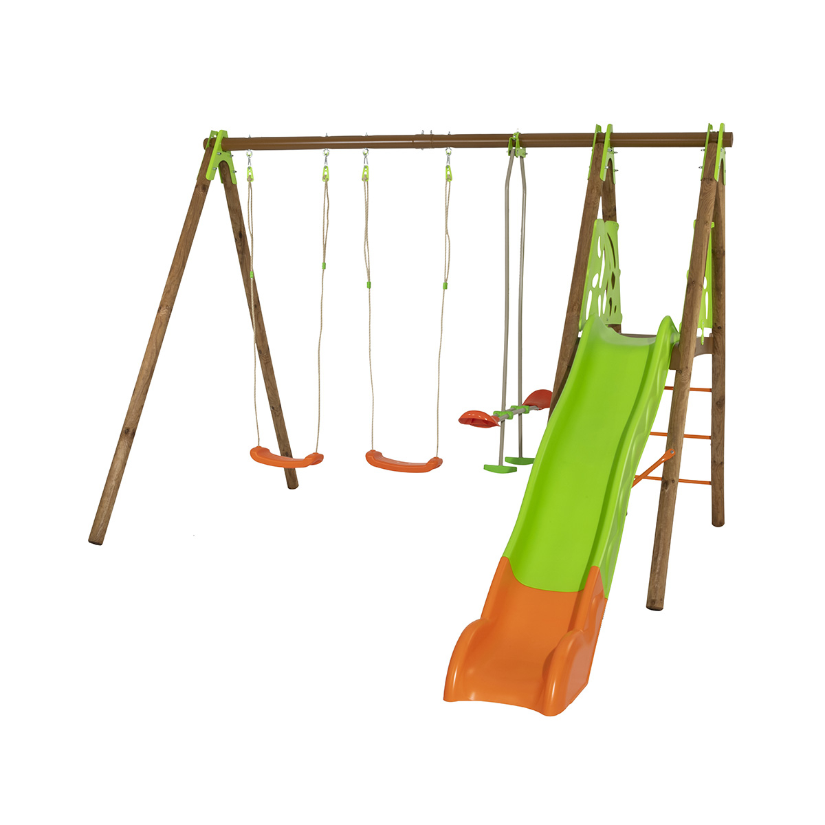 Portique pour 6 enfants, avec deux balançoires, un face à face design et une plate-forme avec toboggan.