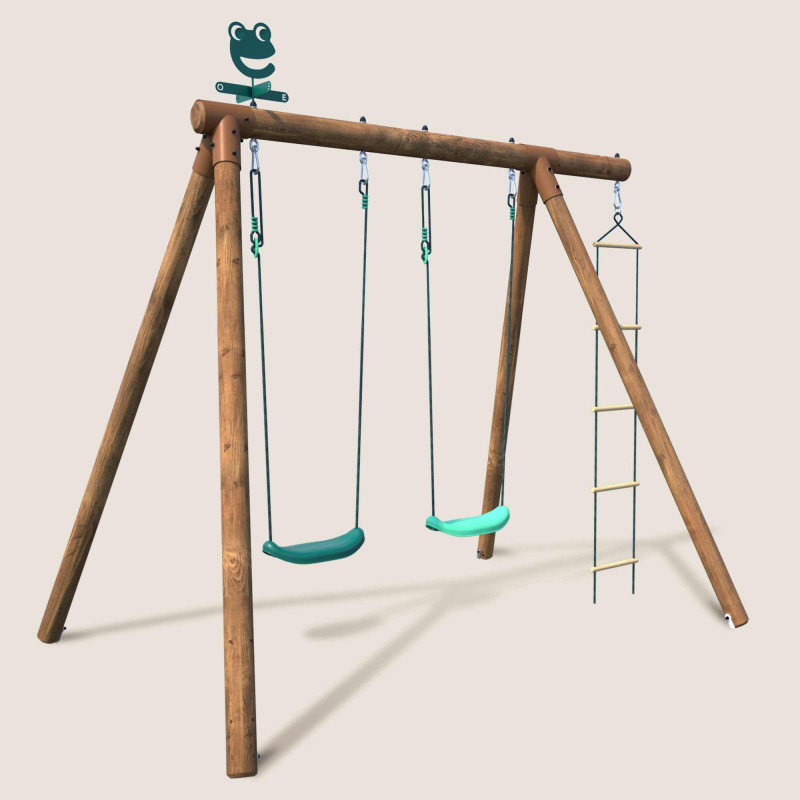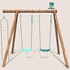 Les deux sièges individuels, suspendus par des cordes réglables, s'adaptent facilement à la taille de chaque enfant grâce à un système de mousquetons simple et sécurisé. L'échelle suspendue, quant à elle, invite à grimper, se hisser et se challenger, renforçant coordination, équilibre et confiance en soi.