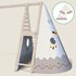 Fabriqué en polyester imperméable, le tipi est conçu pour un usage extérieur. Il est équipé de petites fenêtres latérales pour laisser entrer la lumière naturelle ainsi que d'une porte facilitant l'accès.
