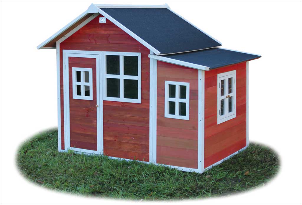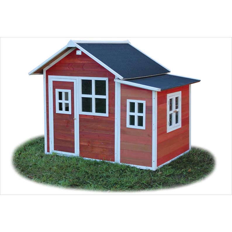 Maisonnette en bois pour enfant rouge Loft 150 Exit Toys en bois de cèdre séché non traité Label FSC. Protégée par une lasure à base d'eau. Avec extension latérale. Montage facile : la cabane se compose de panneaux, portes et fenêtres pré assemblées. Livrée sans plancher. Dimensions au sol : l : 117 cm x L : 170,5 cm x H : 156 cm. Poids : 77,5 kg
