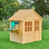 Une adorable cabane en bois dotée d'une cuisine extérieure. La cuisine est livrée avec un vrai robinet fonctionnel, une bassine et un ensemble d'accessoires de cuisine en acier inoxydable.