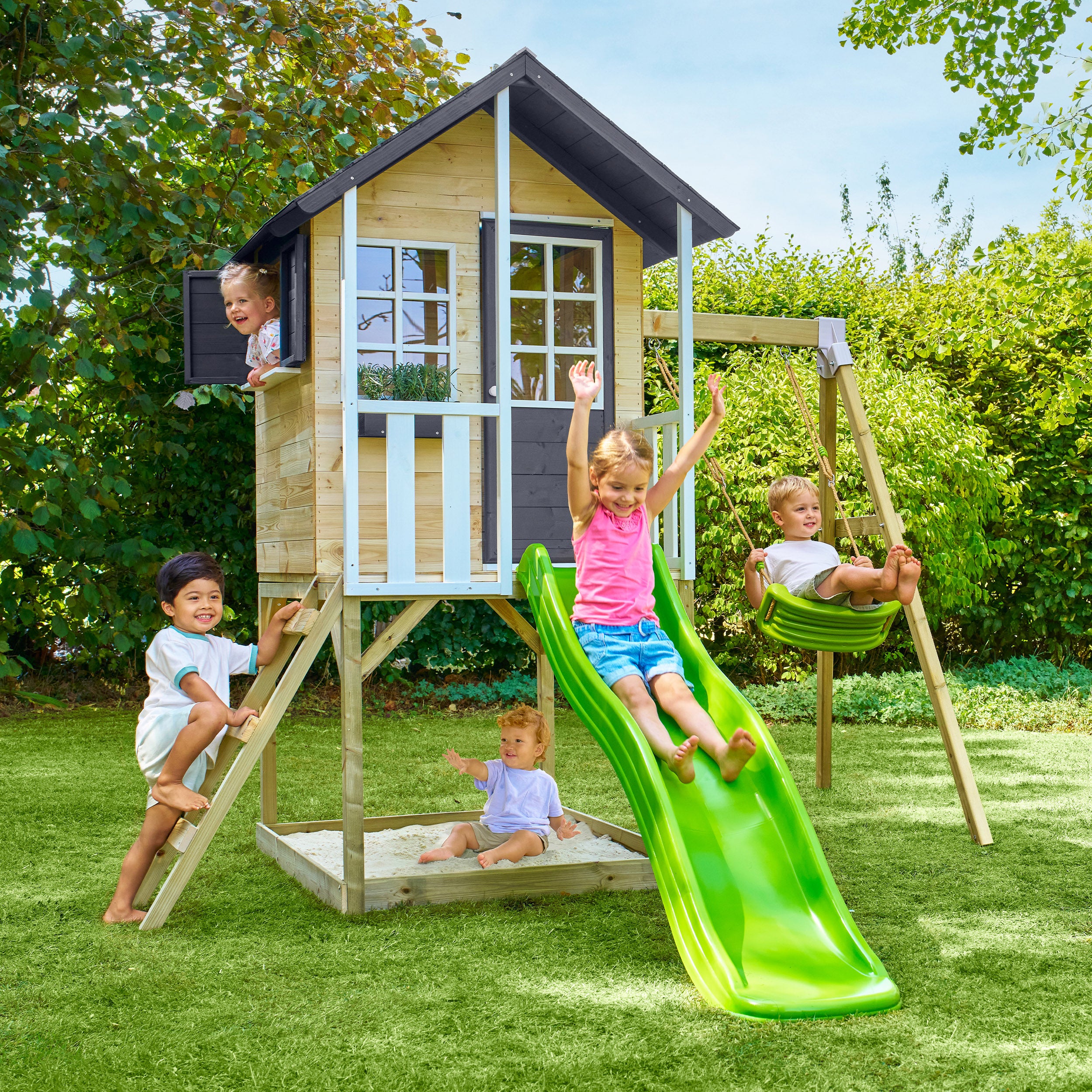 • Équipements : Volets / Porte fenêtre / Fenêtre plexi / Plancher / Terrasse / Pilotis / Echelle / Toboggan / Balançoire / Kit d'ancrage