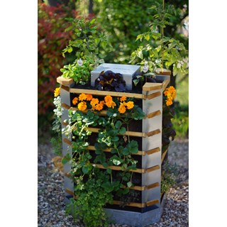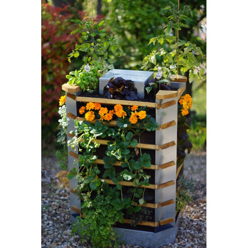 Vertika®, le potager composteur, concept innovant en agriculture urbaine. Ce potager vertical s'installe partout grâce à des dimensions réduites (50 cm x 65 cm sur 1 m de hauteur) : balcons (y compris les balcons "Haussmanniens" très étroits), les terrasses et bien sûr les jardins. Les étages supérieurs permettent de cultiver sans effort.
