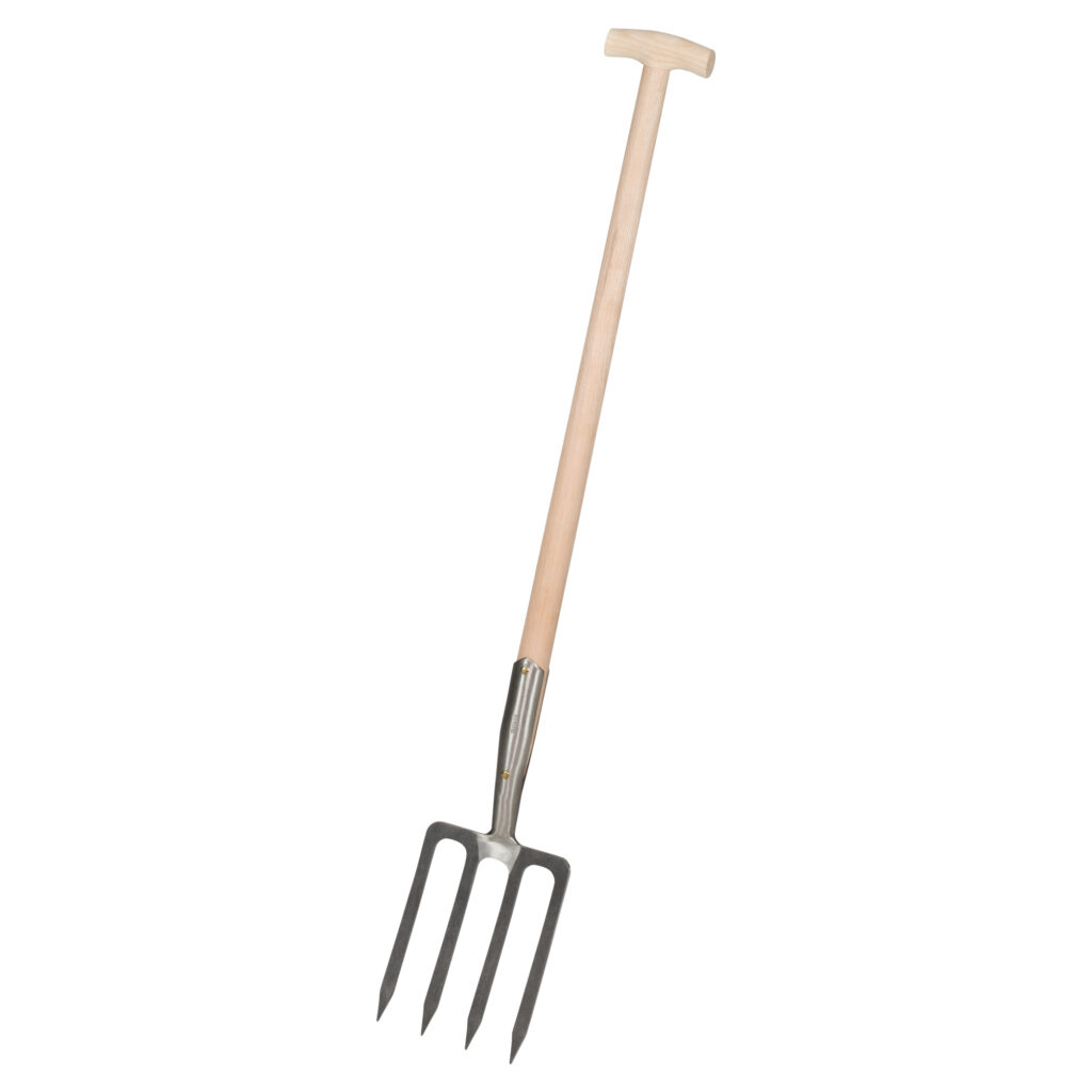 La forme des dents de la fourche à bêcher et leur angle par rapport au manche permettent de l'enfoncer dans le sol sans aucune résistance. Contrairement à la bêche, la fourche à bêcher ne coupe pas le sol, ce qui préserve les racines des plantes du jardin ou des bordures et permet aux plantes de rester en bonne santé.