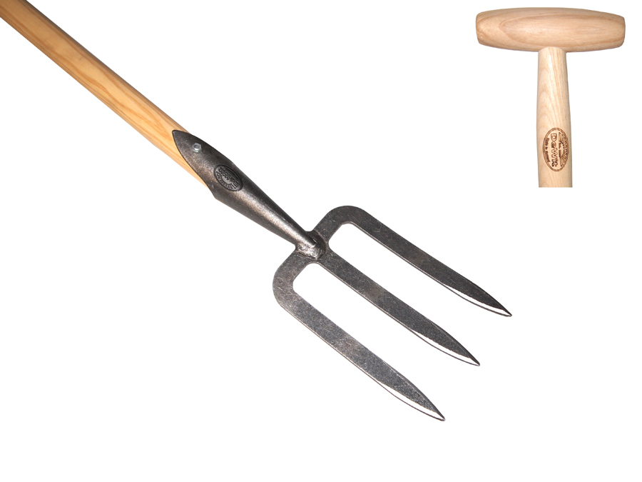 Fourche à 3 dentsl avec manche en bois de frêne 800mm. Idéal et facile à manier, pour décompacter le sol, pour aérer et préparer la terre avant de planter des arbustes et des vivaces.