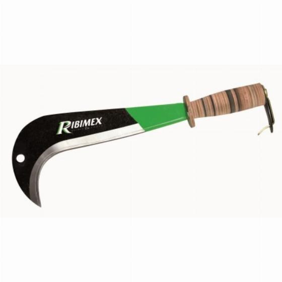 41,5 cm de long. 14,5 cm de large. Un crochet permet de suspendre la serpe. Manche en cuir 12 cm, ovale et haussé d’une garde pour une meilleure prise en main antiglisse et sécuritaire.