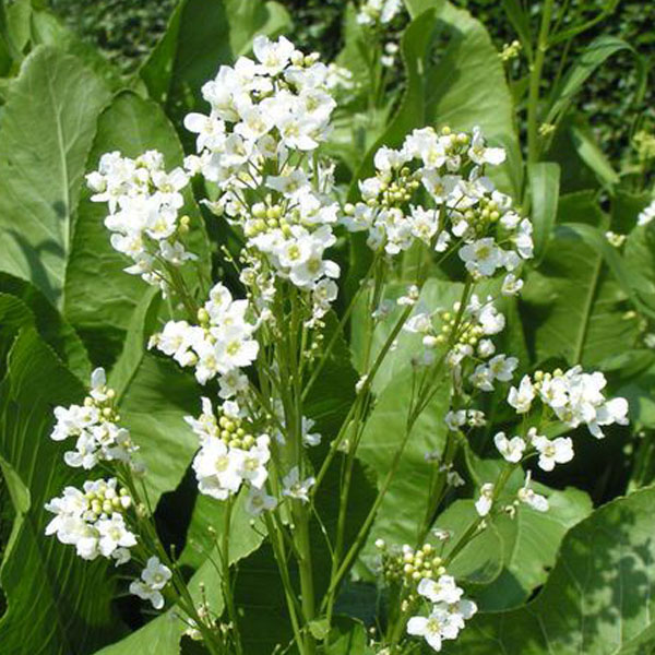 Découvrez l'Armoracia rusticana, plus connue sous le nom de 'Moutarde des Allemands' ou tout simplement raifort. Cette plante vivace au feuillage vert éclatant, appartient à la famille des Brassicacées et se distingue par sa capacité à offrir une racine à la saveur unique et relevée. Très prisée dans la cuisine européenne, la racine de raifort est réputée pour son goût piquant et poivré, souvent employée comme condiment afin de rehausser des préparations culinaires, en particulier les plats à base de viande.