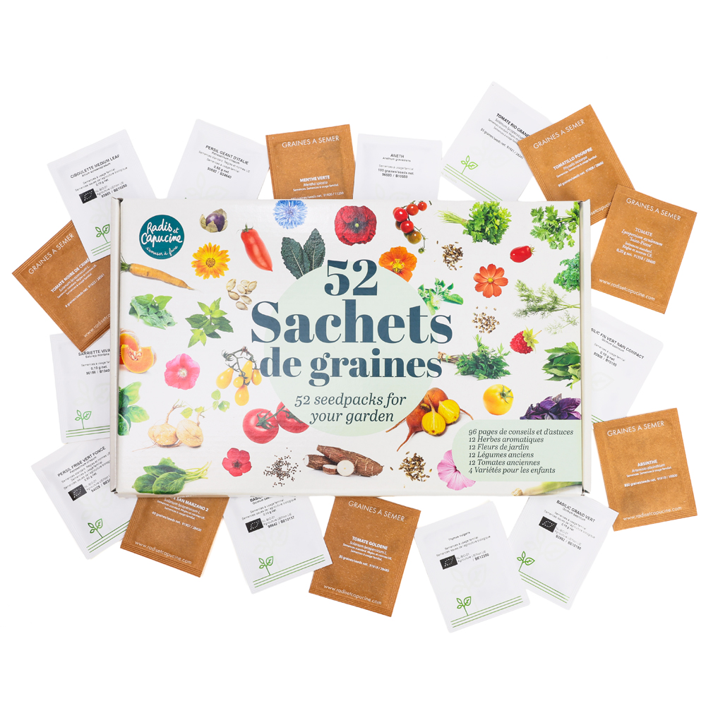 Coffret 52 sachets de graines aromatiques fleurs légumes Radis et Capucine