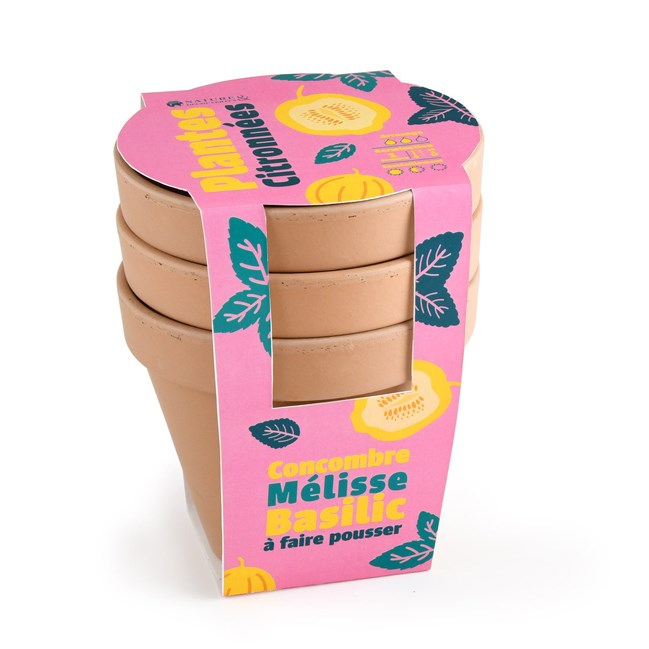 Contient : 3 pots en terre cuite Ø13cm, 3 sachets de graines de plante citronnées (concombre, basilic, mélisse), 9 palets de terre de coco.