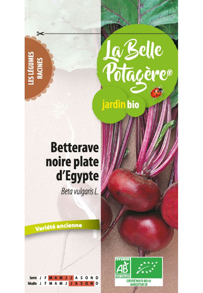 Betterave noire plate d'Egypte - 2,5gUn sachet contenant des graines de légumes non OGM, 100% biologiques et provenant de cultures locales.Les cultures sont en Biodynamie ou suivent le cahier des charges Bio Cohérence.Les graines sont issues de variété d'exception, remarquables ou même anciennes.Pour les besoins des jardiniers exigeants et curieux d'apprendre à cultiver écolo.Caractéristiques Sachet de 2,5 grammes de graines de Betterave noire plate d'Egypte (légumes racines) Variété ancienne Semis : de mars à juillet Récolte : de juillet à novembre