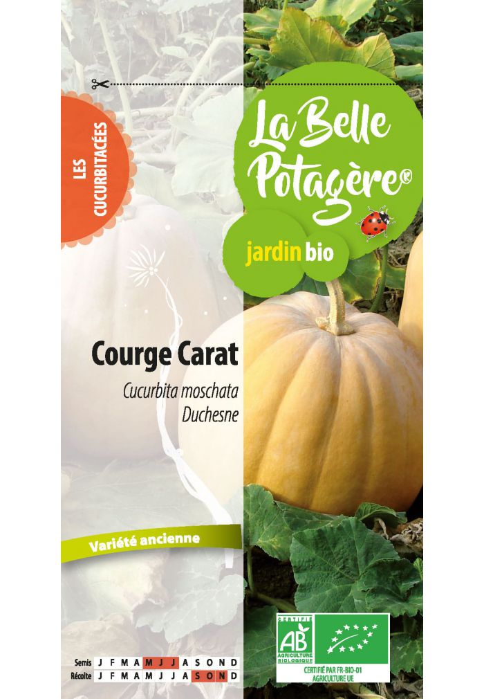 Courge Carat - 1,5gUn sachet contenant des graines de légumes non OGM, 100% biologiques et provenant de cultures locales.Les cultures sont en Biodynamie ou suivent le cahier des charges Bio Cohérence.Les graines sont issues de variété d'exception, remarquables ou même anciennes.Pour les besoins des jardiniers exigeants et curieux d'apprendre à cultiver écolo.Caractéristiques Sachet de 1,5 gramme de graines de Courge Carat (cucurbitacées) Variété ancienne Semis : de mai à juillet Récolte : de septembre à novembre