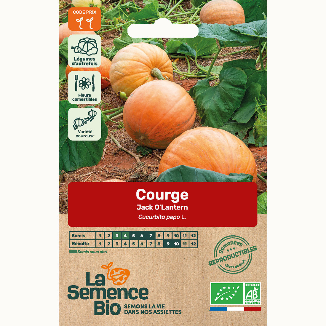 Descriptif : la courge Jack O'Lantern est parfaite pour Halloween ! Facile à cultiver, cette variété aux fruits orange vif est utilisée pour la sculpture et la décoration bien qu'elle soit comestible. Sa saveur est douce et peu prononcée, sublimée en soupe, purée et pâtisserie.