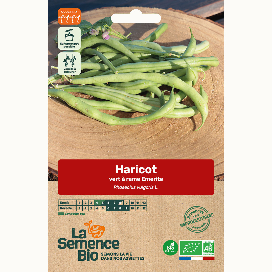 Descriptif : le haricot vert à rame Emerite est une variété précoce, il produit des gousses de 23 à 25 cm droites, sans fil. Particulièrement précoce et productif, il est savoureux et fondant. Hauteur : 180 à 220 cm.