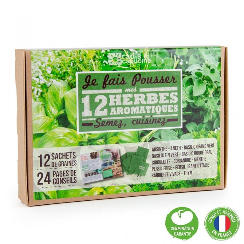 Coffret de 12 graines différentes d'aromates à semer dans votre jardin ou en pot sur votre balcon, avec un guide complet de culture rédigé par un expert jardinier.