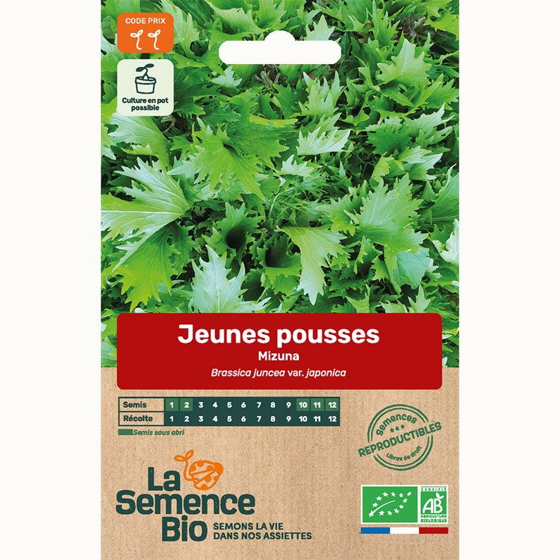 Descriptif : les jeunes pousses Mizuna sont une variété très précoce d'origine japonaise. Leurs feuilles sont vert foncé, finement déchiquetées et érigées. Elles sont douces, croquantes et légèrement poivrées. Idéal en salades composées.