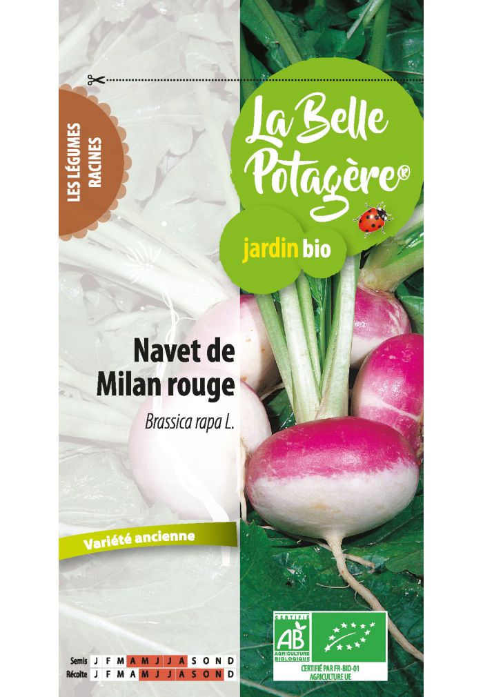 Navet de Milan rouge - 1gUn sachet contenant des graines de légumes non OGM, 100% biologiques et provenant de cultures locales.Les cultures sont en Biodynamie ou suivent le cahier des charges Bio Cohérence.Les graines sont issues de variété d'exception, remarquables ou même anciennes.Pour les besoins des jardiniers exigeants et curieux d'apprendre à cultiver écolo.Caractéristiques Sachet de 1 gramme de graines de Navet de Milan rouge (légumes racines) Variété ancienne Semis : de avril à août Récolte : de mai à novembre