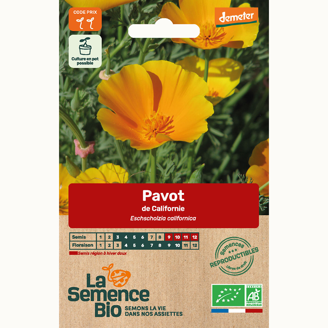 Descriptif : le pavot de Californie est une fleur annuelle ou vivace selon les zones climatiques. Elle se caractérise par sa fleur orange à 4 pétales très ouverts. Il peut devenir géant en terre trop riche et se ressème spontanément.