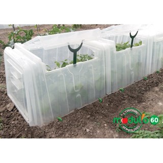 Mini serre de forçage rigide. 80 cm de long , 60 cm de large, ce lot permet de former un tunel de 2.4 m de long. L'encrage au sol se fait par un systeme de piquets rigides. Un bac de récupération d'eau est intégré au somment du tunel.