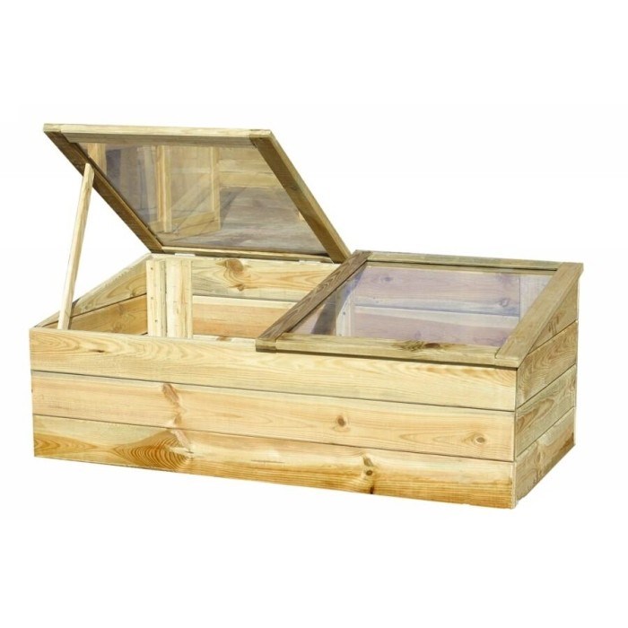 Cette serre se présente sans fond, elle s'ouvre en deux parties vitrées en plexiglas transparent, et montées sur des charnières apparentes.
