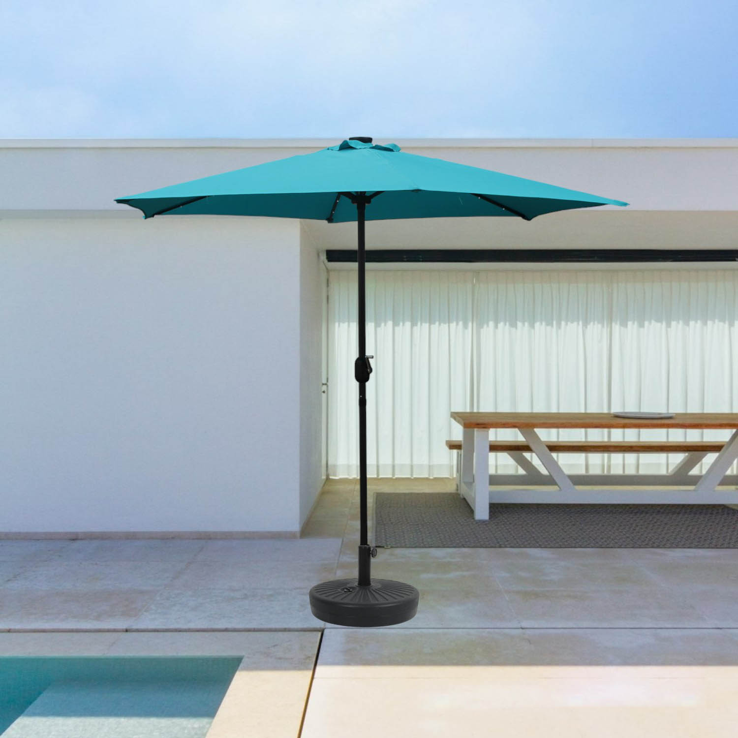 Partagez un repas convivial entre amis ou en famille tout en etant protege du soleil grâce à ce parasol droit rond avec led. Ce parasol rond au design tendance et sa couleur de toile bleu lui permettra d'apporter une touche de couleur à votre exterieur.