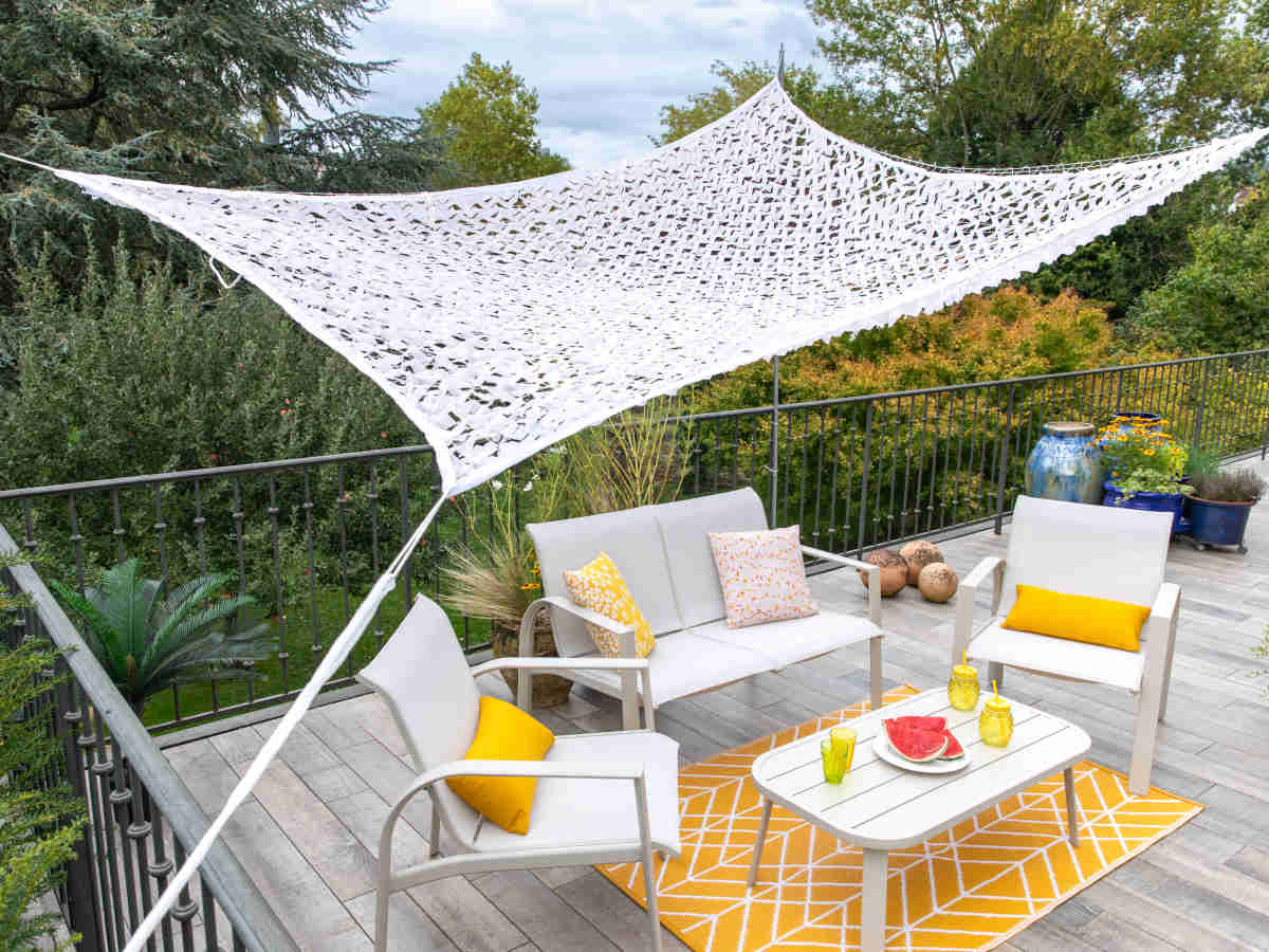 Disponible en coloris army sable, army gris ou blanc, il s'intègre naturellement près du mobilier de jardin et des plantations. Format large pour couvrir une table, un salon d'extérieur ou un espace détente.
