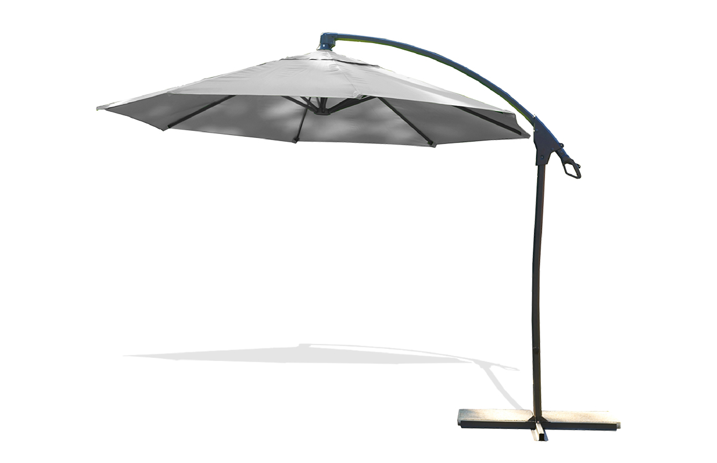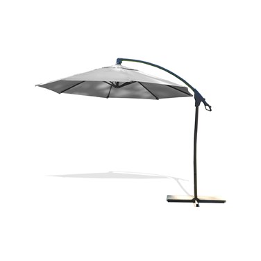Parasol déporté MALAGA avec toile octogonale imperméabilisée en polyester gris. Ouverture simple par manivelle. Mât en aluminium gris. Pieds en acier pré-percés, fixation au sol obligatoire. Dalles de parasol vendues séparément.