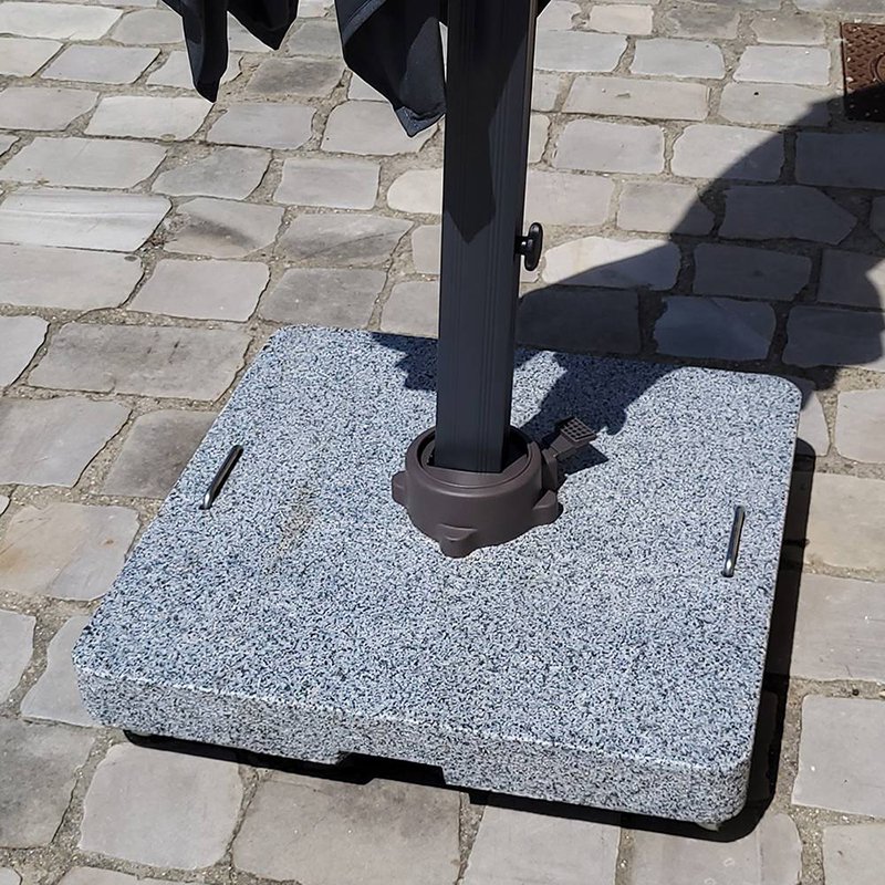 Si vous souhaitez déplacer votre parasol déporté sur votre terrasse ou près de votre piscine, vous devrez fixer ce dernier sur une base mobile de poids suffisant pour lester le parasol.