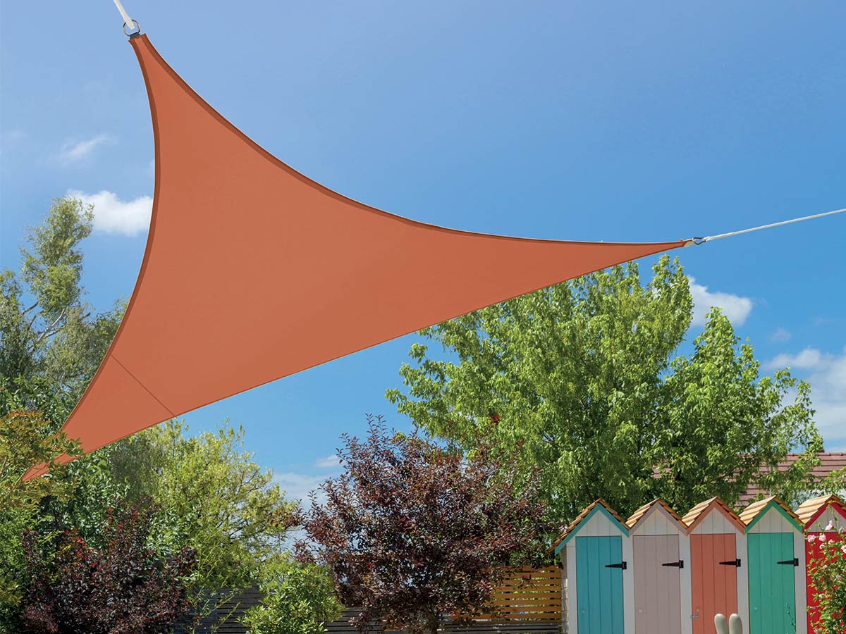 Voile d'ombrage triangulaire Flex 5 x 5 x 5 m. Idéal pour vous ombrager du soleil lors des fortes chaleurs.