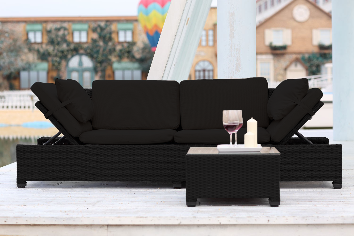 Succombez à la fonctionnalite du salon de jardin Corfou en resine tressee noire ! Confortable, ses accoudoirs entièrement relevables vous permettent de creer votre canape ideal, transformez-le en lit, en canape ou en transat en un tour de main, et prelassez-vous au soleil ! Ses coussins et sa structure en resine tressee facile à nettoyer vous accueilleront tout au long de l'ete.