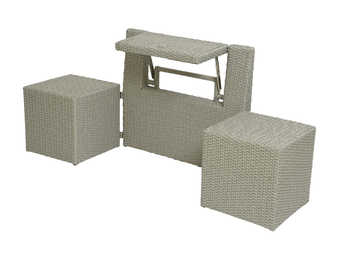 En position replié, il fait office de banc. En position déplié, il devient un salon de jardon avec 2 poufs et 1 petite table.
