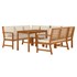 Avec son design intemporel, cet ensemble de salle à manger de jardin en bois avec coussins ajoute une touche de charme rustique à votre patio, terrasse ou jardin. Matériau durable : le bois d'acacia massif est un matériau naturel magnifique. Le bois d'acacia un bois dur tropical, qui est dense, robuste et durable.Cadre stable : le cadre en bois de l'ensemble de salle à manger garantit robustesse et stabilité.Table pratique : la table offre un espace pour les repas, les boissons et autres objets décoratifs.Conception modulaire : chaque pièce est facile à déplacer, ce qui vous permet de créer facilement différents agencements adaptés à vos besoins. Vous pouvez également trouver d'autres meubles sectionnels avec le même design et le même style dans notre boutique en ligne pour arranger vos propres modèles de meubles.Expérience de siège confortable : avec les coussins de siège et de dossier bien rembourrés, l'ensemble de salle à manger d'extérieur est très confortable. Bon à savoir :Pour faciliter au maximum le montage, chaque produit est livré avec des instructions. Remarque :Pour que vos meubles d'extérieur restent beaux, nous vous recommandons de les protéger avec une housse imperméable.La table est plus basse que les tables à manger habituelles, et elle est particulièrement adaptée pour être combinée avec des ensembles de canapés de jardin.