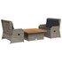 Cet ensemble de salon de jardin est le complément parfait de votre arrière-cour, terrasse ou patio, offrant un espace confortable et accueillant pour discuter avec la famille et les amis ou simplement se détendre et profiter de l'extérieur. Matériau durable : la résine tressée, également connue sous le nom de poly rotin, est un matériau synthétique solide et nécessitant peu d'entretien qui ressemble au rotin naturel. Elle est légère, facile à nettoyer et couramment utilisée pour les meubles d'extérieur en raison de sa durabilité et de ses propriétés de résistance aux intempéries.Dossier réglable : vous pouvez régler le dossier dans n'importe quelle position en tirant sur la poignée et le remettre rapidement dans sa position initiale.Housse amovible et lavable : ces coussins de siège sont dotés de housses amovibles pour un lavage et un entretien faciles.Expérience d'assise confortable : ce mobilier d'extérieur, doté de coussins épais, offre une expérience d'assise confortable.Dessus stable et facile à nettoyer : cette table de jardin a un dessus en bois d'acacia robuste, durable et facile à nettoyer avec un chiffon humide.Cadre robuste et stable : le cadre en acier enduit de poudre est solide, stable, durable et résistant à la corrosion et aux intempéries, ce qui garantit des performances durables. Bon à savoir :Pour que vos meubles d'extérieur restent beaux, nous vous recommandons de les protéger avec une housse imperméable.